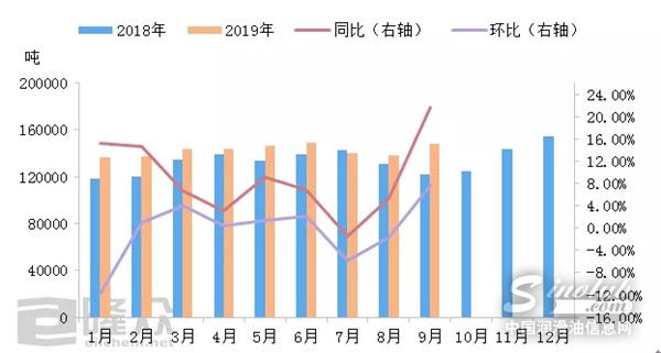 统计的数据显示,2019年前三季度,国内炼厂白油总产量为128.36万吨,同比增加8.62%,产量增长的主要原因是新增产能陆续投产。上半年黄河新材,淄博胜炼,清源集团白油装置相继开工,虽综合开工率维持在45-50%左右,但是市场供应量增加,下游终端用户选择性增加,行业竞争凸显。国庆节后西北地区伊泰宁能新装置投产,5#工业白油陆续外销,月底河南君恒集团计划开工,截止到10月底国内白油产能增加到375万吨。