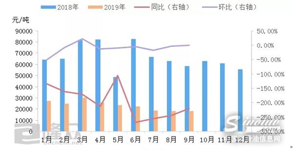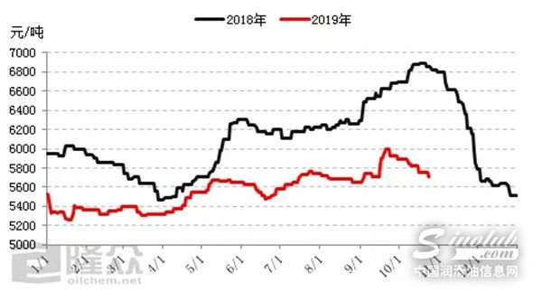 从上图可以看出2019年国内5#白油均价远低于2018年的同期价格,截止到10月底,国内5#白油均价为5707元/吨,同比2018年下降16.75%。去年国庆节前后,随着国内柴油市场向好,国内小粘度白油价格紧跟上调,涨幅在400元/吨左右;而2019年三季度价格的上调只是出现在中秋节时国际原油黑天鹅事件,带动了国内小粘度白油的一波上涨趋势。随后国际原油高位回落,小粘度白油价格高位回调,出现了旺季不旺的局面。导致此现象的根本原因,一方面是国内实体经济增速放缓,下游油墨、纺织、化纤、塑料和粘合剂行业经过了前几年的高速发展后白油需求量萎缩,另一方面是国内新增装置投产后,产能产量过剩已成为常态。