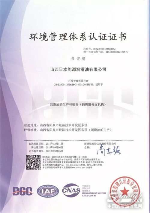 在2019年的“质量月”活动中,“山西日本能源润滑油有限公司”再次被中国质量检验协会授予“全国质量诚信标杆企业”称号。