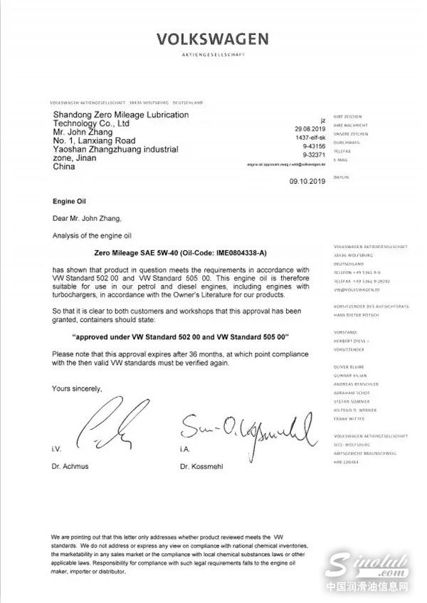 近日,德国大众汽车集团技术中心再次认证零公里润滑油汽机油 SAE 5W40系列产品通过VW50200/VW50500的标准认证,三年证书到期后的延续认证成功证明了大众汽车对于零公里产品的认可。零公里认证油系列产品再添新成员,大众VW50200/50500 SAE 5W40认证油品即将上市!