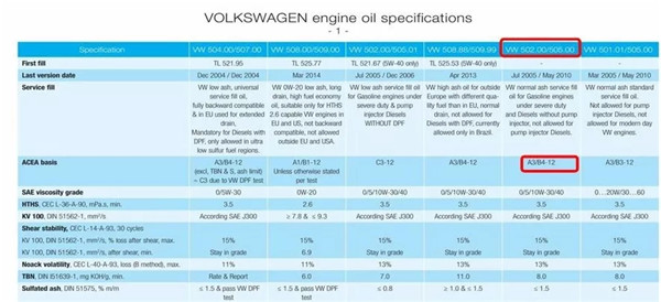 VW506.01:适用于VW集团的涡轮增压泵喷嘴TDI引擎及涡轮增压共轨高压喷射TDI引擎。具有“加长换油周期”特性 。