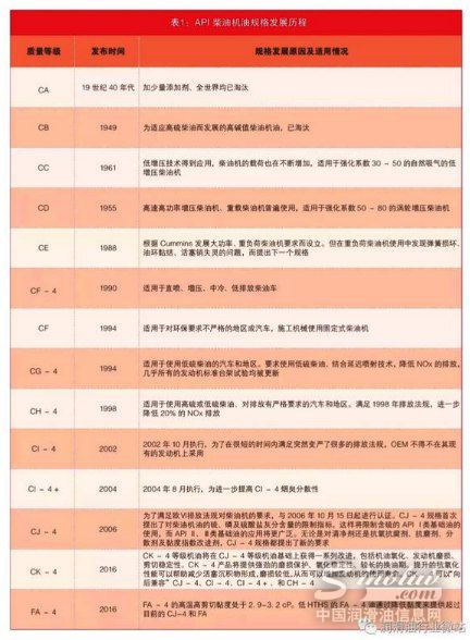 2006年发布了CJ-4。为了满足欧VI排放法规的要求而推出的CJ-4对硫、磷和硫酸盐灰分等指标进行了严格限定。2016年12月1日,API新的机油标准CK-4和FA-4正式认证上市。API最新柴油机润滑油标准CK-4和FA-4将满足柴油发动机制造商改进后对润滑油的性能要求。新的性能等级标准将提供更好的燃油经济性,并通过防止机油氧化、发动机磨损、微粒过滤器阻塞、活塞积炭和低、高温性能下降而加强对发动机的保护。长城润滑油在此过程中也进行了相关的调整。