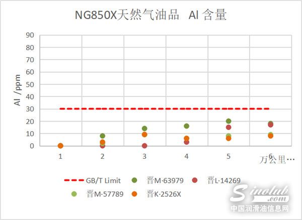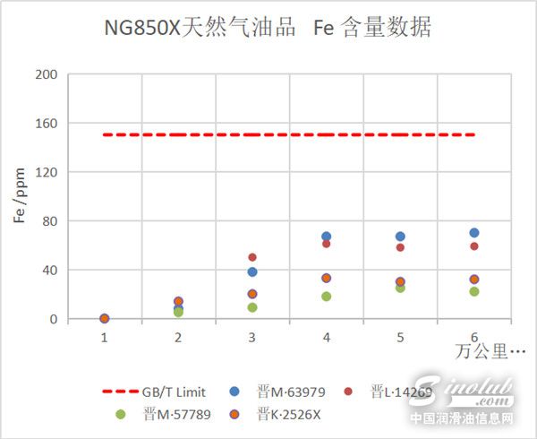 旧油中的元素含量是直接反馈油品在抗磨性能,通过检测铁、铜、铝等金属含量的变化,可以反馈发动机不同部件的磨损情况,通过以上数据看出在换油期内磨损元素极低,NG850X天然气油品抗磨性能突出。