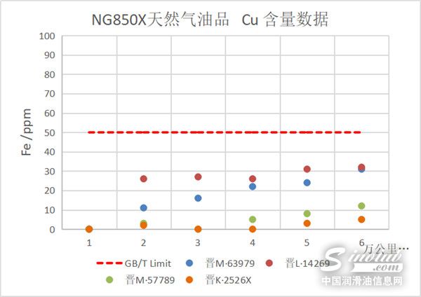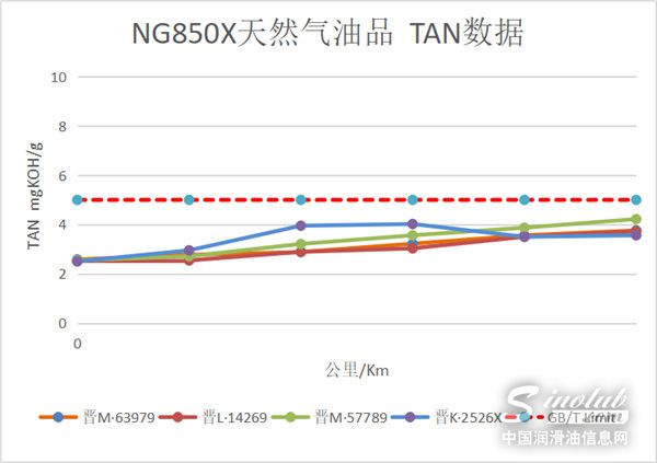 由于天然气发动机燃烧室温度远高于普通汽、柴油发动机,促使所用油品的加快老化,旧油中的酸值反映油品中有机酸的总量,数据看出NG850X拥有较好的中和酸的性能及抗氧化性能。
