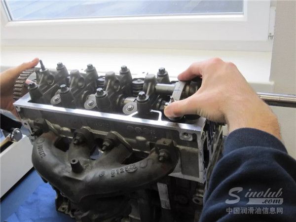 汽车在城市道路中停停开开和低温低速运行,由于发动机转速低,机油压力也较低,此时对发动机的凸轮挺杆的抗磨损保护要求较高。因此,本专利提出一种使用滚柱摇臂摩擦副机构的汽油发动机,在摩擦副机构上施加一定的负荷,在低油温条件或发动机低速大扭矩工况下,检测在滚动摩擦条件下滚柱及凸轮表面的磨损状态,从而评价润滑油抗磨损性能的台架装置及方法。此方法将有助于高档车用发动机油的研制开发。