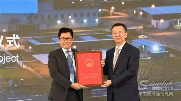 湛江市市长姜建军(右)向巴斯夫全球高级副总裁、中国新一体化基地负责人、巴斯夫(广东)一体化基地有限公司总经理林汉平颁发项目不动产权证。