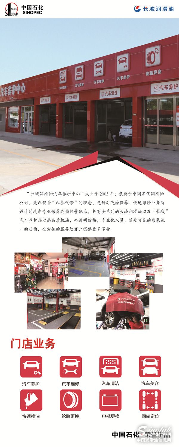 目前,长城润滑油汽车养护中心服务包含汽车养护、维修、清洁、美容、快速换油、轮胎更换、电瓶更换、四轮定位等多项业务,能够提供机油、发动机保护剂、刹车油、防冻液、齿轮油等全车养护品,是具有专业服务水平的新型汽车养护中心。