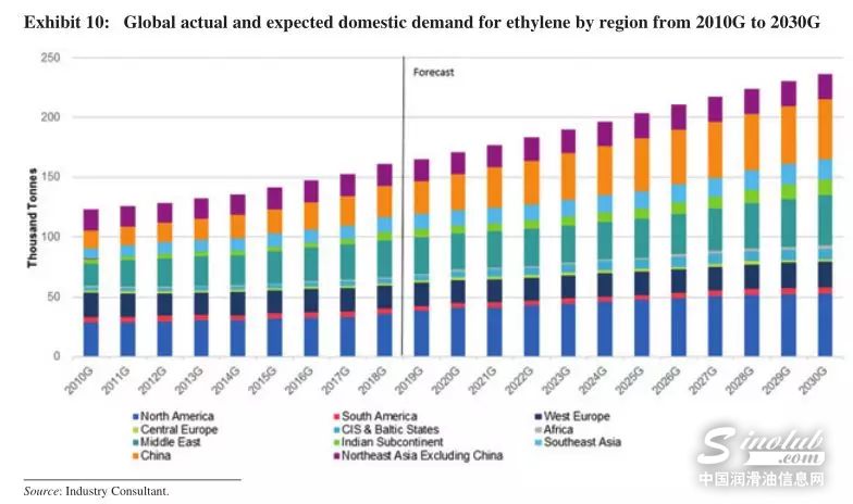 预计化学品需求的增长速度将超过原油和成品油需求的增长速度。2010年至2018年,化工的重要原料之一——乙烯需求的年复合增长率为3.5%,预计2018年至2030年复合增长率为3.3%,主要由中国和北美的需求推动。