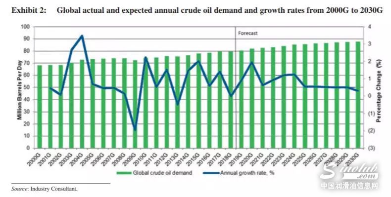 2、近年来,替代能源使用量的增加、原油使用效率的提高和汽车电气化,导致全球原油需求增速不及全球GDP增速。2000年至2018年,全球原油需求年复合增长率为0.9%,预计2018年至2030年复合增长率为0.8%。