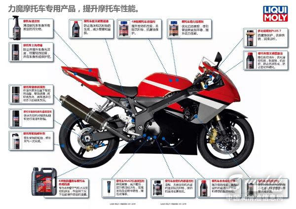 除摩托车机油外,力魔摩托车产品线中还包含摩托车燃油系统清洁产品、润滑系统养护产品、车身清洁保护产品、摩托车专用制动液等多种产品,可全面满足摩托车各个部位的养护需求。