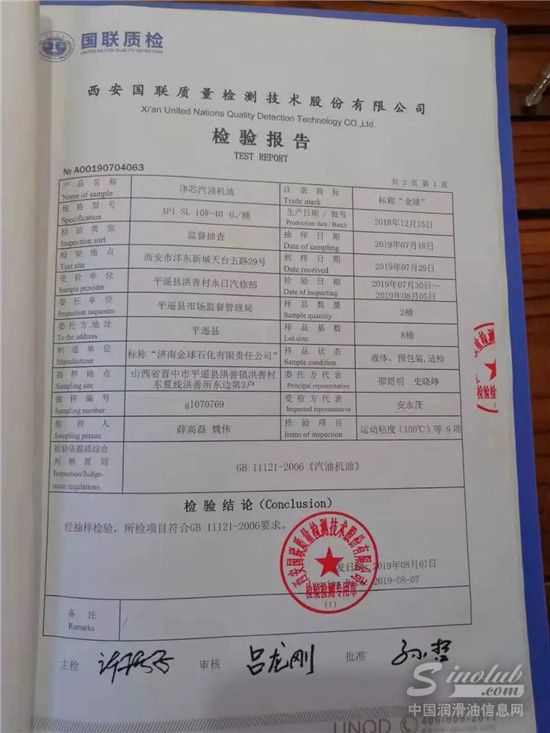 为提高润滑油的质量,保障润滑油的使用安全,推进润滑油行业的发展,平遥县市场监督管理局特进行了一场润滑油抽检活动,在这次抽检过程中,金球石化平遥的代理商有幸被抽检小组抽中,并对净芯汽油机油进行产品质量法定检测,经抽样检验,表示所检项目符合GB 11121-2006要求,予以合格。