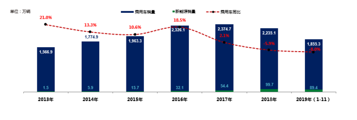 据乘联会显示,2019年1-11月中国乘用车销量1,855.3万辆,同比下降8.0%,其中新能源销量89.4万辆,同比增长6.8%,同比虽有增长,但增幅较去年有明显回落。在整体经济下行的情况下,内需不足、排放加严、新能源补贴退坡、中美贸易战等因素影响,2019年整体车市仍然不容乐观。