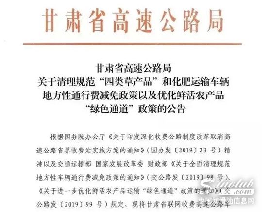 从2020年1月1日起,甘肃省取消化肥运输车辆减免政策,取消苜蓿草等"四类草"减免政策,执行全国统一"绿色通道"减免目录。