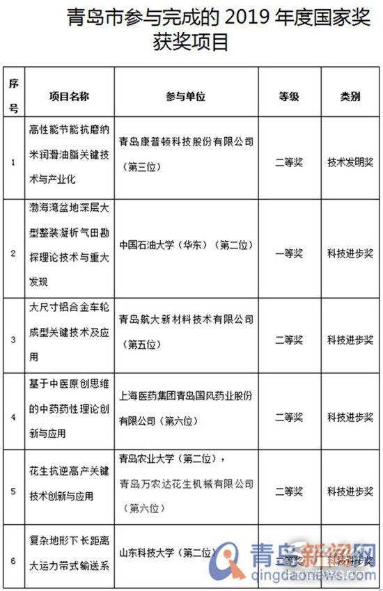 2019年度国家科学技术奖励大会,青岛市获奖项目共涵盖材料、油气工程、农艺、国土资源、中医中药和外科等9个专业领域。山东科技大学崔洪芝团队主持完成的“耐磨蚀抗热震结构功能材料及涂层技术”项目是我市近年来在材料领域取得的新突破,获技术发明二等奖。中国石油大学主持完成的“多类型复杂油气藏叠前地震直接反演技术及基础软件工业化”项目,持续攻关20余年,使得我国在叠前地震直接反演与油气识别领域处于国际领先地位。青岛农业大学和青岛万农达花生机械有限公司参与的“花生抗逆高产关键技术创新与应用”项目,历经18年攻关研究,在抗逆栽培理论及关键技术方面取得重大突破,创造了花生实收单产世界纪录。