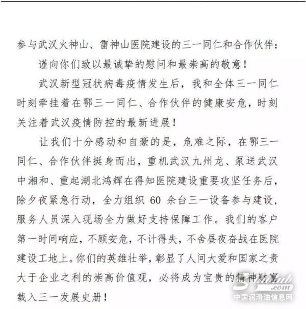 1月28日,三一集团董事长梁稳根致信参与武汉火神山、雷神山医院建设的三一同仁和合作伙伴,向他们表示诚挚慰问和崇高敬意。