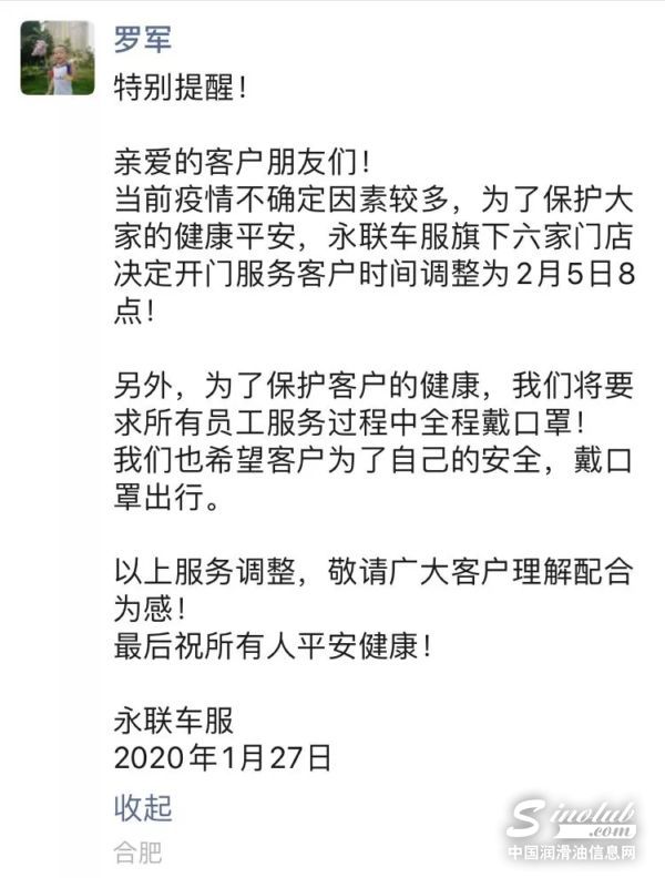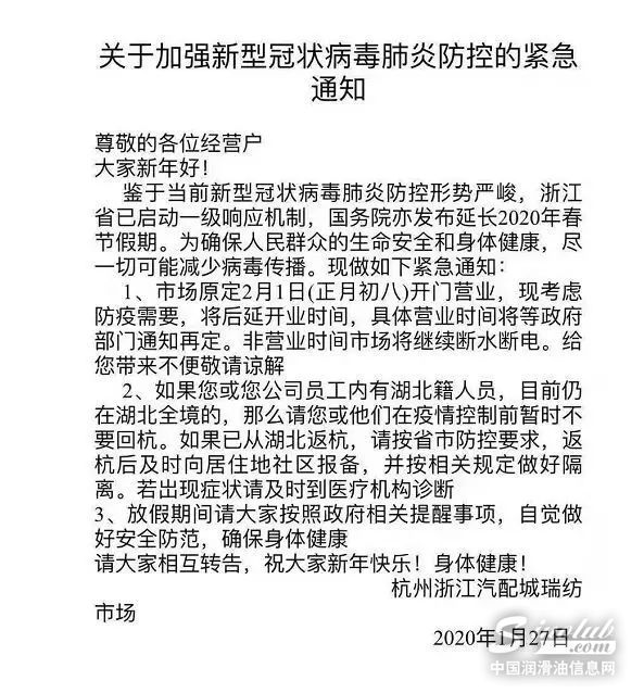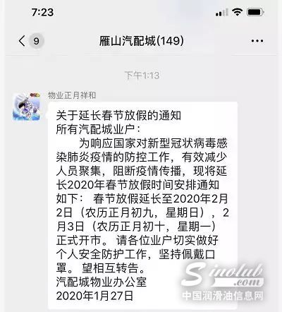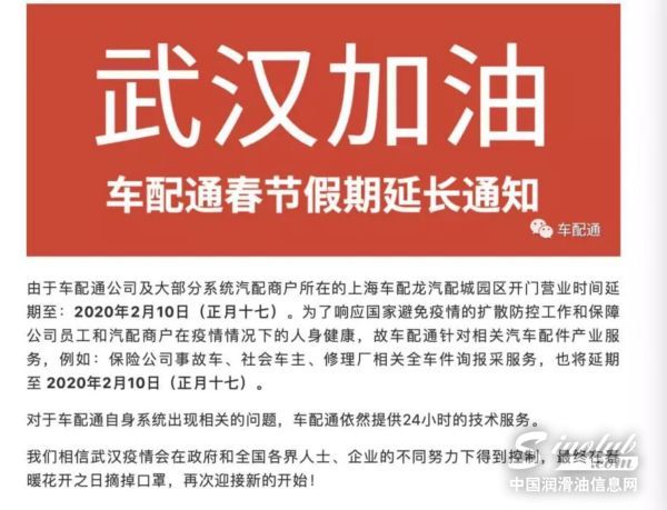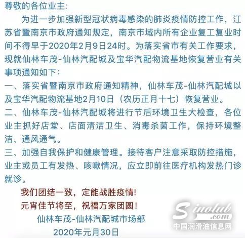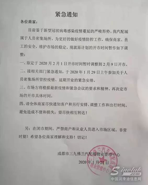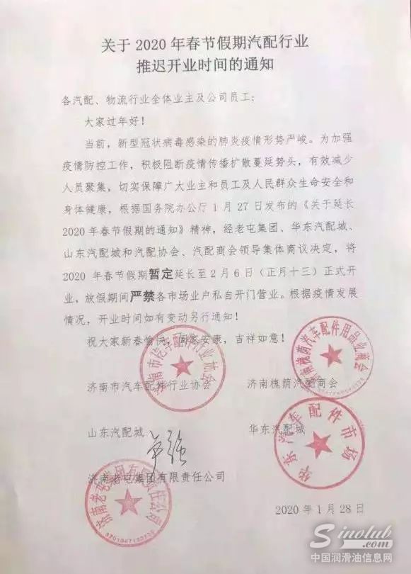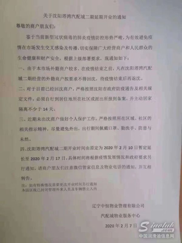 为了响应政策要求,各地汽配城和连锁门店也普遍推迟了营业时间,并已下发通知: