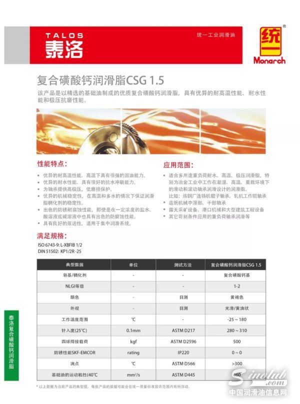 工业润滑油作为工业生产中的必备辅料,性能全面的复合磺酸钙润滑脂从中脱颖而出,成为了生产的好助手。专业的制作手段至今已有约半个世纪的历史,而复合磺酸钙润滑脂CSG 1.5,复合磺酸钙二硫化钼润滑脂CSG Moly,则是在经典上再做升级,在精选基础油的前提上添加了优质固体稠化剂,制作过程中就具有出色的极压性能,力求成品在保证性能全面的同时再做提高。