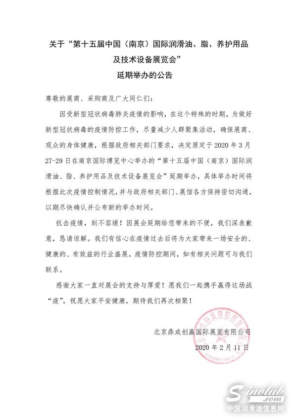 因受新型冠状病毒肺炎疫情的影响,根据政府相关部门要求,“第十五届中国(南京)国际润滑油、脂、养护用品及技术设备展览会”将延期举办,具体公告如下:
