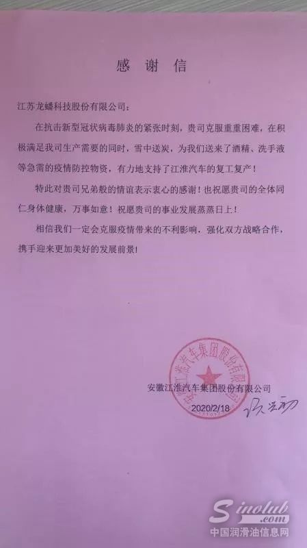 2月18日,一封由江淮汽车项兴初总经理亲笔签名的感谢信送到了龙蟠科技。究竟是什么事情,能够“惊动”项总亲自签名,表达对龙蟠的感谢呢?