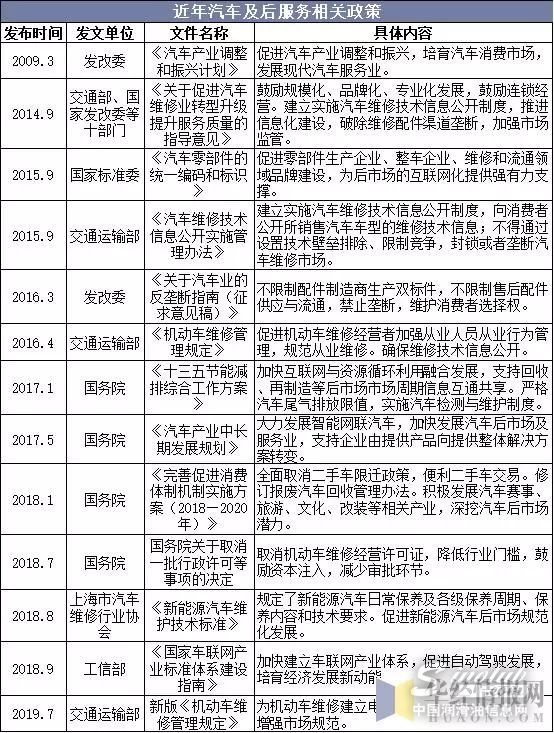 自2009年起,有关部门频繁出台中国汽车产业的相关政策,为汽车市场及后服务市场创造有序的竞争环境。例如,汽车市场及后市场政策对第三方服务提供商及零配件供应商越来越开放,汽车生产商需向维修经营者无差别公开汽车维修技术信息,打破汽车维修领域垄断,即给第三方服务提供商及零配件供应商带来了新机遇,保证汽车后市场信息的透明化,渠道的多元化。