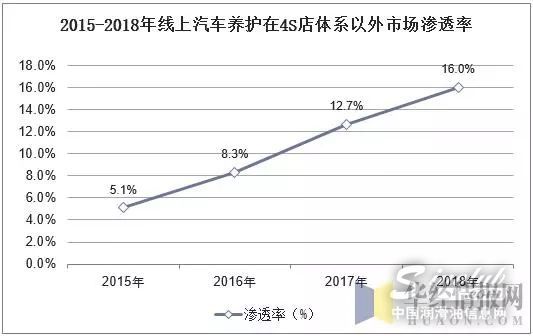 2018年线上汽车养护在4S店体系以外的市场渗透率已经达到16%,整体而言,在整个汽车后市场规模不断扩大,市场渗透率不断提高的背景下,中国线上汽车养护景气度不断上升。