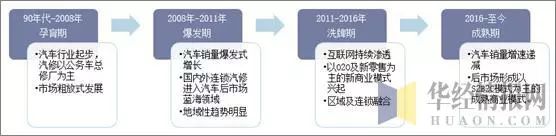 2000-2008年,中国汽车产销激增,国内外连锁汽修企业瞄准维保蓝海市场大量涌入,专注于销售和主机厂2009-2015年,随上一阶段新车“脱保”,汽修和配件更替为后市场带来巨大空间。2011年互联网开始大举渗透行业,带动O2O及新零售商业模式兴起,电商平台致力于实现S2B2C扁平化供应链模式,减少中间流通环节的固定资产及服务费用投入,借助互联网流量优势,融合资本与技术,推动汽车后市场进入红海领域。