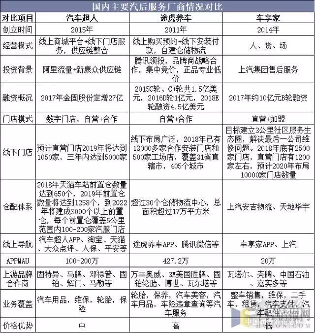 目前国内汽后服务市场互联网基因连锁品牌主要为:汽车超人、途虎养车和车享家。各方在覆盖门店数量、流量来源、供应链建设、合作品牌、融资能力、扩张方式等均各有所长。
