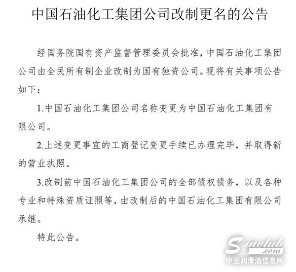 上海清算所官网2月21日发布《中国石油化工集团公司改制更名的公告》,公告内容为: 经国务院国有资产监督管理委员会批准,中国石油化工集团公司由全民所有制企业改制为国有独资公司。有关事项公告如下: 1.中国石油化工集团公司名称变更为中国石油化工集团有限公司。 2.上述变更事宜的工商登记变更手续已办理完毕,并取得新的营业执照。 3.改制前中国石油化工集团公司的全部债权债务,以及各种专业和特殊资质证照等,由改制后的中国石油化工集团有限公司承继。