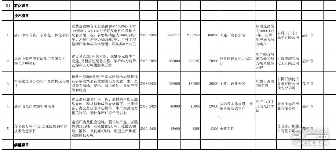 湛江中科合资广东炼化一体化项目、惠州中海壳牌石油化工有限公司SMPO/POD项目、中石化茂名分公司产品结构优化项目、惠州出光润滑油华南项目、茂名10万吨/年连二亚硫酸钠扩建技术改造项目