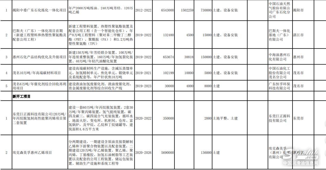 揭阳中委广东石化炼化一体化项目、巴斯夫(广东)一体化项目首期(新建工程塑料和热塑性聚氨酯及配套公用工程)、惠州石化产品结构优化及升级项目、茂名10万吨/年高端碳材料项目、茂名6万吨/年催化剂综合回收再利用项目