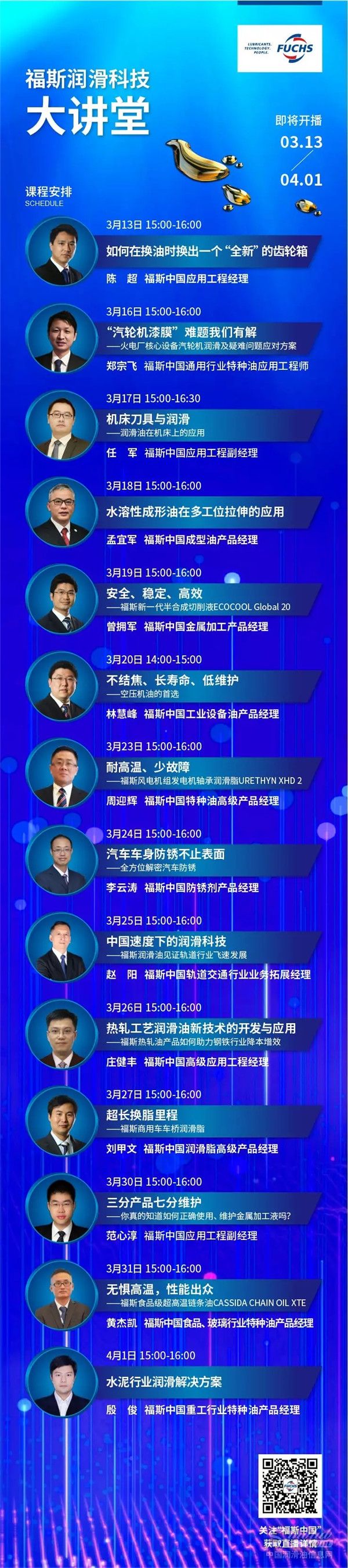 为此,福Sir倾力集结了众多福斯润滑大咖,针对不同行业、不同产品、不同工艺的润滑知识为大家准备了一轮全方位、高质量的直播课程,3月13日-4月1日期间,每个工作日不间断为大家带来润滑干货。