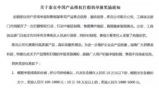 2019年5月,泰克公司联合警方及工商执法部门,共同展开打假维权行动。此次,破获制假、售假案件数起,捣毁多家制假窝点。警方及工商执法部门,对涉案人员进行调查,并对主要责任人采取拘留处罚等措施。泰克公司表示,对提供售假商家信息的举报者,他们会给予一定的奖励。