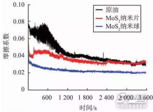图4 原油和在原油中添加不同形貌的 MoS2 添加剂的平均摩擦系数变化曲线图