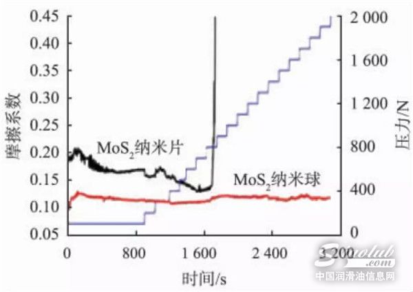 在最佳添加量时(质量分数0.2%)与原石蜡油相比,摩擦系数降幅高达47%。在极压实验中(如图5所示),加入片状MoS2的润滑油中,最高负载为700 N,而加入球形硫化钼的润滑油中,加载压力直到1 900 N,实验才停止,可以看出,MoS2纳米球具有杰出的极压性能(>2.24 GPa)。对摩擦表面进行分析发现了从类富勒烯MoS2颗粒上脱落的纳米薄片。说明在摩擦过程中,纳米MoS2颗粒进入两接触面的摩擦区域,在摩擦的过程中球形MoS2表面产生脱落层,逐渐转移到接触钢表面,并与润滑油的协同作用下形成较厚的摩擦膜,达到了良好的润滑效果。无机类富勒烯MoS2颗粒良好的抗磨减摩性能得益于它的球形形状以及球体边缘部分化学键闭合所产生的较稳定结构,减小了它的化学活性;而片状的二硫化钼由于高的化学活性使其易于团聚且容易氧化,阻碍了它润滑性能。