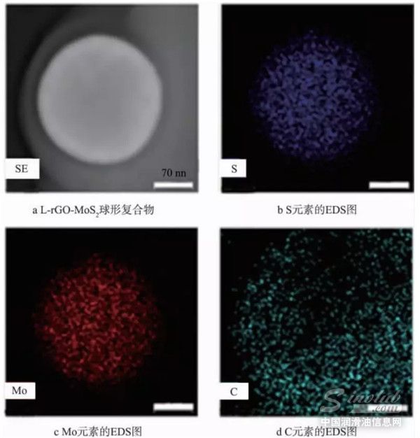 Luo等之后又用相同的方法将MoS2与石墨烯复合,成功将球状的MoS2嵌入到石墨烯片层之间。扫描电镜分析(如图6所示)发现,这种MoS2不是简单地附着在石墨烯片上,而是被石墨烯层包覆,使球形MoS2纳米颗粒固定在石墨烯片上,将L-rGO-MoS2这种复合物添加到润滑油中,用四球摩擦试验机进行了摩擦实验,发现与原油相比,摩擦系数降幅25%,磨斑直径降幅58%,且优于单纯的MoS2纳米颗粒和单纯的石墨烯作为润滑油添加剂。这种L-rGO-MoS2复合物添加剂优异的润滑效果得益于MoS2的球形形貌及石墨烯较高的机械强度和自润滑性能,以及两者形成的独特的松散叠层结构能稳定分散在原油中,且在高温下不易氧化的优点,为润滑油添加剂的制备提出了新的思路。