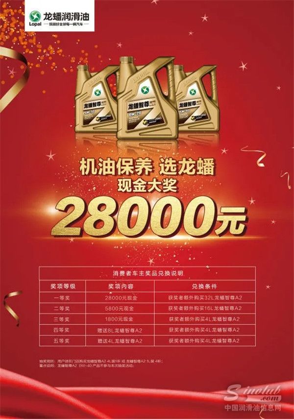 活动方式:龙蟠智尊A2 4L装1听或龙蟠智尊A2 1L装4听参与抽奖
