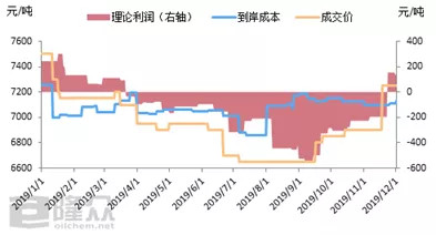 2018进口二类150N年利润全年处于正值,到岸成本先涨后跌,进口商利润空间较大,盈利可观。2019年初到岸成本下行,利润虽为正值但空间微小,从三月中下旬开始,到岸成本高于成交价,进口二类150N利润进入倒挂。其中8月和9月倒挂最为严重, 8月开始美元兑人民币汇率破“7”且居高不下,国内润滑油厂商受环保等政策限制开工率不足,加之受国内二类低粘度的低价冲击,进口二类150N直到9月中旬价格推涨,10月台塑船期推迟,直接导致150N货源紧俏,而下游润滑油厂商的采购需求坚挺,150N扭亏为盈,实际利润尚可。