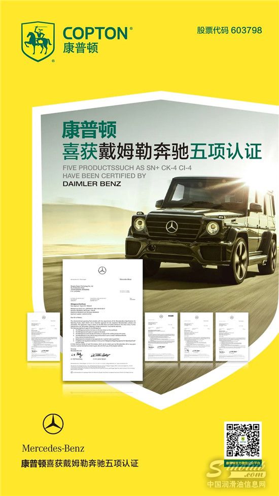近日,康普顿再获戴姆勒奔驰五项认证证书,包含汽机油的SN+、柴机油的CI-4、CK-4等。