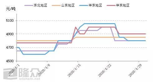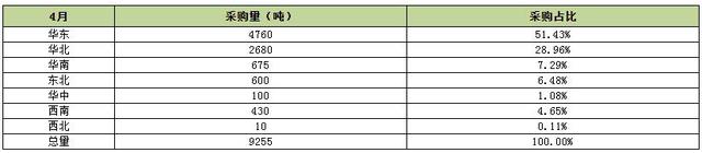 国内润滑油市场疫情过后需求逐渐恢复,4月车用润滑油和工业润滑油需求出现明显增加,大中型润滑油工厂库存量也逐渐消化完毕,进入补货周期,使得4月份基础油市场价格出现大幅上扬,涨幅累计在300-400元/吨左右。隆众电话调研的下游109家润滑油工厂的生产情况来看,4月份润滑油工厂全面复工,用油量达到94170吨,相较于3月份环比增加18.53%。其中,有81家完成了采购,采购总量达9255吨。采购量大的以华东、华北为主,分别占比51.43%、28.96%。