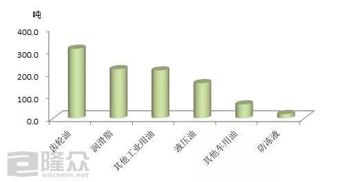 4月齿轮油订单量308.6吨、润滑脂订单量218.1吨、其他工业润滑油212.6吨、液压油155.9吨、其他车用润滑油61.6吨、防冻液18.8吨。