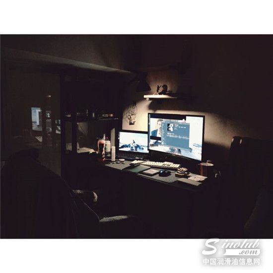 电脑屏幕的光笼罩着润滑油媒体人的脸