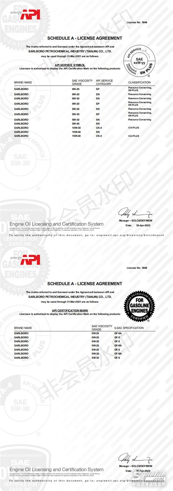 2020年5月1日,API(美国石油协会)正式面向全球发布API SP/GF-6汽油机油规格技术认可。该规格历时10年开发完成,正式取代API SN/GF-5 Plus规格成为全球质量级别最高的汽油机油规格。圣保路润滑油凭借国际领先的润滑技术研发实力,第一时间通过认证,成为国际首批获得此认证的润滑油企业。