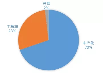 由上图看出,广东省各企业原油一次加工能力占比中,中石化占70%,再次是中海油的28%,最后是民营企业的2%。