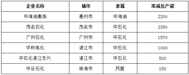 广东省炼油装置(能产出汽柴煤油的装置)主要有茂名石化、广州石化、中海油惠炼、中科炼化、中石化湛江东兴炼厂以及中谷石化等。详情如下:
