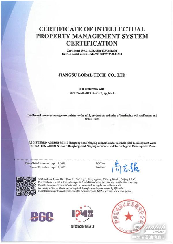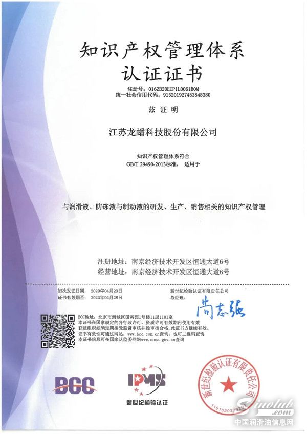 近日,江苏龙蟠科技股份有限公司已顺利完成GB/T29490-2013《企业知识产权管理规范》贯标认证,获得了知识产权管理体系认证证书,这是对龙蟠科技产品研发和自主创新能力的又一重大认可。