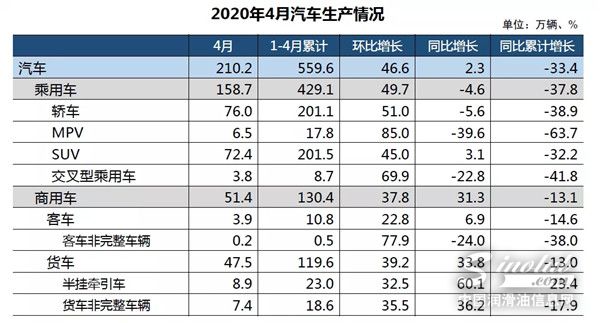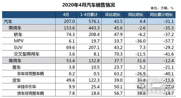 4月,汽车产销分别完成210.2万辆和207万辆,环比增长46.6%和43.5%,同比分别增长2.3%和4.4%,月增速为今年以来的首次增长,其中销量更是结束了连续21个月的下降。
