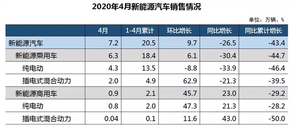 1-4月,新能源汽车产销均完成20.5万辆,同比分别下降44.8%和43.4%。其中纯电动汽车产销均完成15.5万辆,同比分别下降46.9%和44.6%;插电式混合动力汽车产销分别完成5.1万辆和4.9万辆,同比分别下降37.6%和39.8%;燃料电池汽车产销分别完成292辆和280辆,同比分别增长23.2%和21.7%。