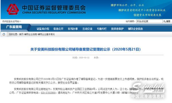 中国润滑油信息网据广东证监局官网披露,位于广东东莞市松山湖高新区的安美科技股份有限公司已办理了辅导备案登记,开始冲刺资本市场。安美科技成立于2003年,是润滑、清洗、防锈的解决服务方案提供商,主要产品包括润滑油等工业设备油以及金属加工液等。