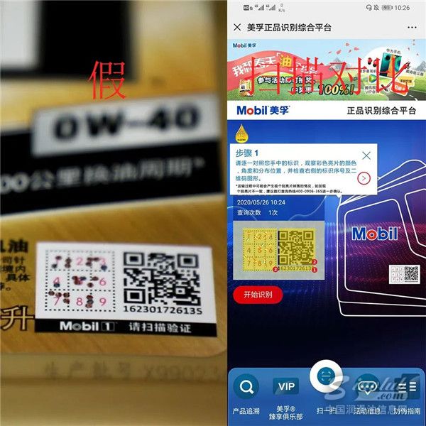 每个品牌的机油都有其防伪标识,可通过微信、QQ等任意查询软件扫描二维码,对比其亮片分布,辨别真伪。