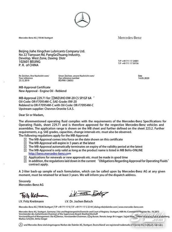 2020年5月14日,戴姆勒公司给北京嘉禾兴产润滑油公司生产的MIZUHO御用1号0W-20全合成油颁发了符合梅赛德斯.奔驰MB-229.71标准认证的证书,这标志着嘉禾兴产御用1号0W-20机油的质量受到了世界顶级汽车制造商的认可。此前,嘉禾兴产公司已有了皇钻5W-40和5W-30机油2款机油获得了梅赛德斯.奔驰MB-229.5和MB-229.51标准认证。